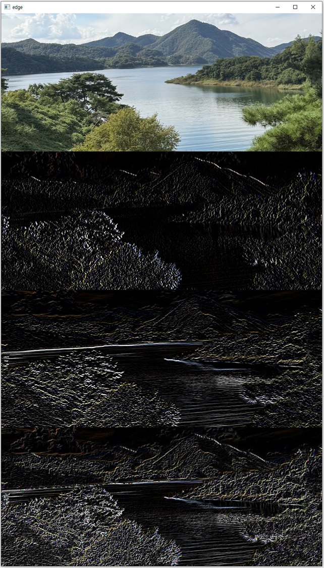 - 대각선 경계 검출은 약하지만, 기본 미분 필터와 로버츠 교차 필터에 비해 상하/좌우 경계는 뚜렷하게 검출하는 것을 볼 수 있다.