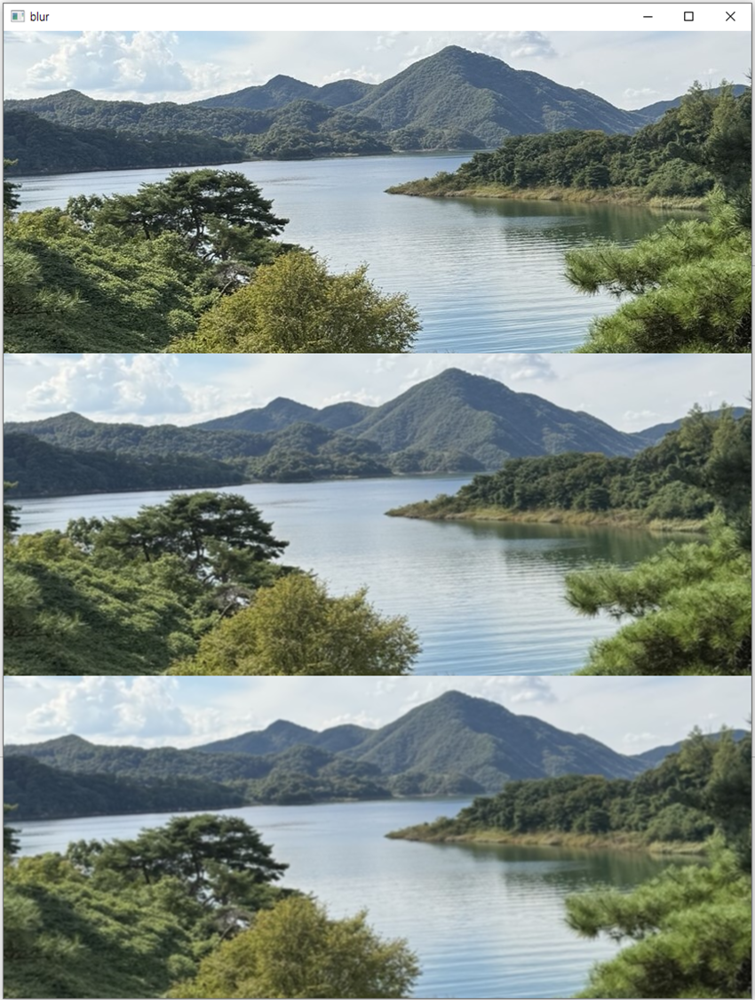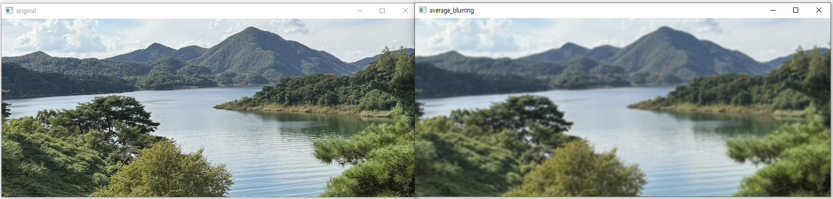 ■ OpenCV의 cv2.blur(src, ksize, dst, anchor, borderType) 함수를 이용하면 위의 예시처럼 직접 커널을 생성하지 않고도 커널 크기만 지정해 주면 평균 블러링을 적용할 수 있다.