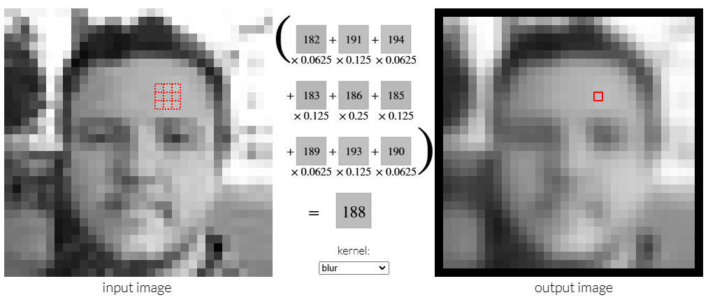 - 산출된 값은 평균 블러보다 크게 다르지 않아 보일 수 있지만, 중요한 점은 중심 픽셀 주변에 가까운 값(대상 픽셀 100과 인접한 픽셀들)이 더 크게 반영되고, 멀어질수록 적게 반영되는 것을 볼 수 있다.