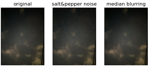■ 이 방법은 소금&후추 잡음(salt&pepper noise)을 제거에 효과적이다. 소금&후추 잡음이란 잡음이 마치 소금과 후추처럼 흰색(255) 또는 검은색(0)으로 이뤄진 잡음을 말한다. 즉, 영상/이미지의 임의의 픽셀을 0 또는 255로 만드는 잡음이다.