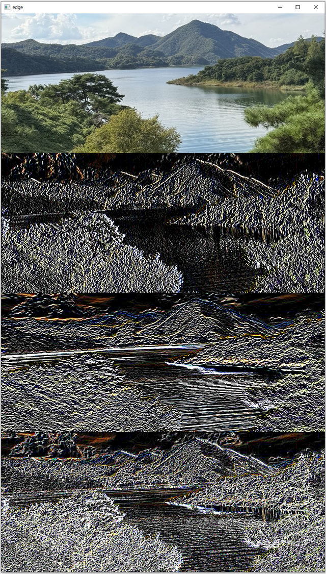 ■ cv2.filter2D( ) 함수를 이용해 소벨 필터를 적용해도 되지만, OpenCV에서 별도의 샤르 필터 함수 cv2.Scharr(src, ddepth, dx, dy, dst, scale, delta, borderType)를 제공한다.