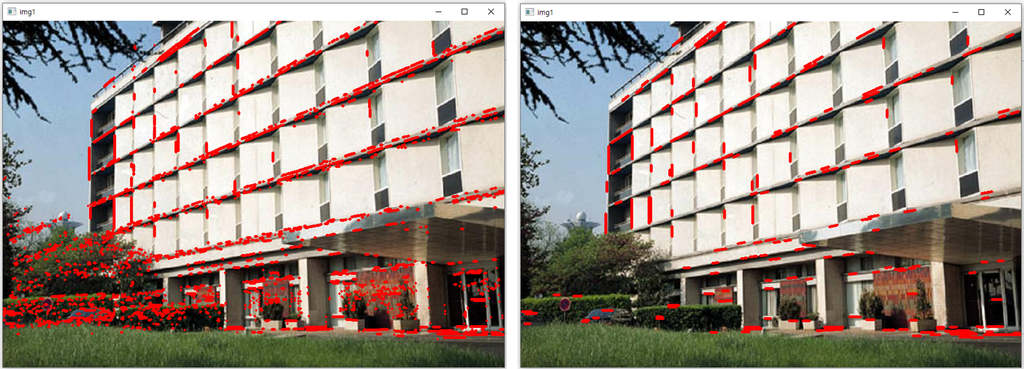 - 직선으로 간주할 엣지 픽셀의 최대 간격을 늘린 결과, 오른쪽 그림처럼 화단 부분의 복잡하고 매우 작은 엣지는 무시되었지만, 건물 부분의 엣지도 무시된 것을 볼 수 있다.