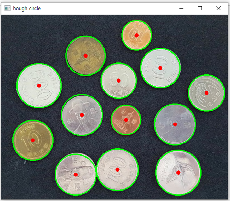 cv2.circle(img,(i[0], i[1]), i[2], (0, 255, 0), 2) # 원 둘레에 초록색 원 그리기