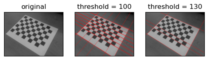 - threshold는 직선으로 판단할 임곗값. 즉, 만나는 점의 기준이다. 임곗값이 작으면 많은 선이 검출되지만 정확도가 떨어지고, 임곗값이 크면 검출되는 선의 개수가 감소하지만 정확도가 올라간다.