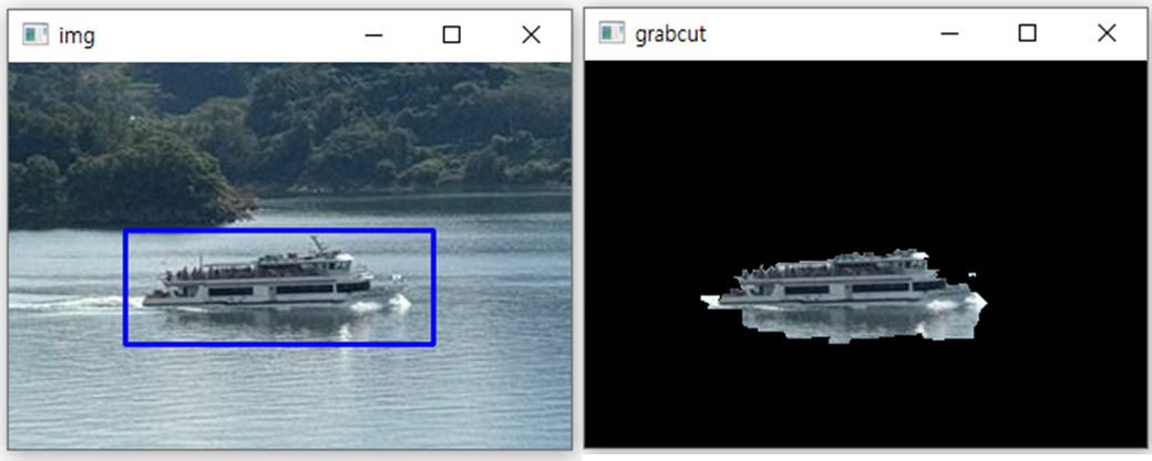 - 이렇게 1차적으로 전경과 배경을 분리한 뒤, mode에 cv2.GC_INIT_WITH_MASK를 지정해서 다시 cv2.grabCut( )를 적용하면, 더 정확한 mask를 얻을 수 있다. 이때 bgdModel, fgdModel은 cv2.grabCut( ) 함수 내부에서 사용할 임시 배경과 전경이다.