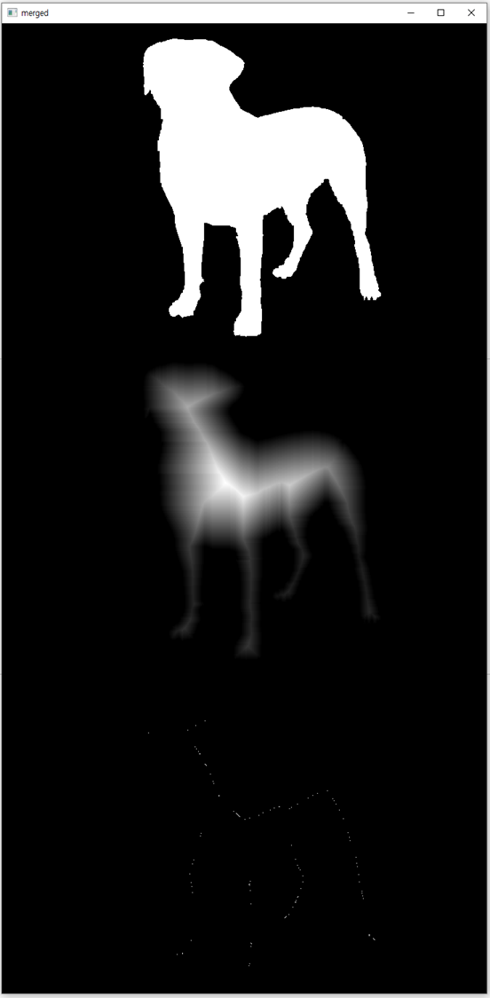 ■ 거리 변환은 그 뼈대를 검출하는 방법으로 외곽 경계로부터 가장 멀리 떨어진 객체 영역의 뼈대를 찾는다. 정확히는 바이너리 이미지를 이용해 픽셀 값이 0인 배경으로부터 가장 멀리 떨어진 전경(객체 영역)의 픽셀 값 255인 부분을 찾는다.