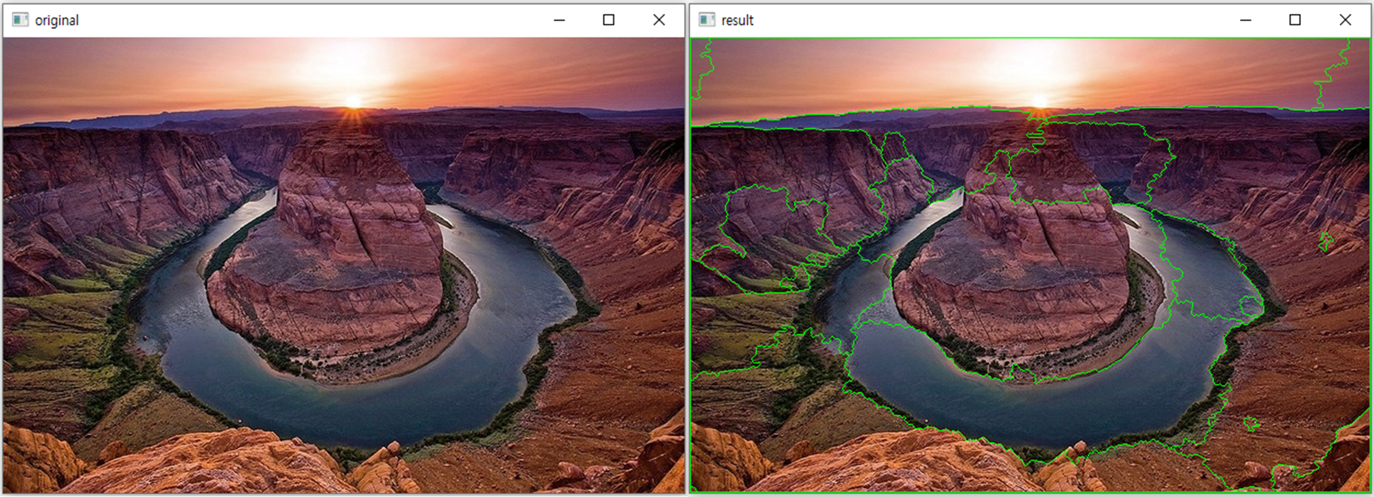 img[markers == -1] = [0,255,0] # 마커에 -1로 표시된 경계를 초록색으로 표시