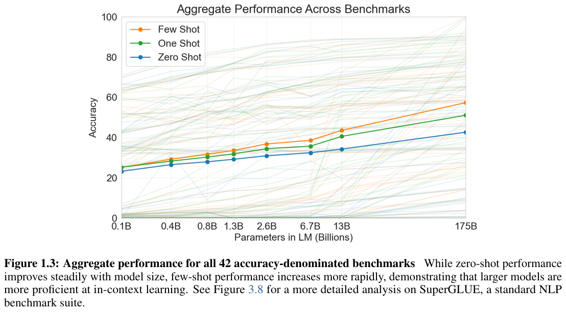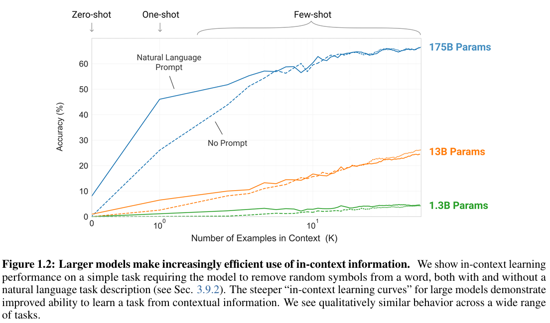 - in-context learning을 통해 모델 파라미터 내에 많은 기술과 태스크를 흡수시킬 수 있고, 모델 용량(파라미터 수)을 늘리면 더 많은 기술과 패턴을 저장하고 처리할 수 있다.