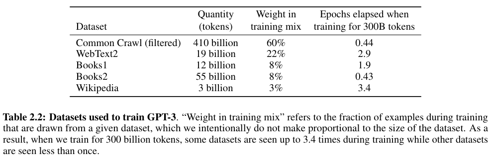 ■ Common Crawl과 Books2 데이터셋은 훈련 중에 한 번 미만으로 샘플링(0.44, 0.43)되지만, 다른 데이터셋들은 2~3번 샘플링(WebText2는 2.9, Books1은 1.9, Wikipedia는 3.4)되는 것을 확인할 수 있다.