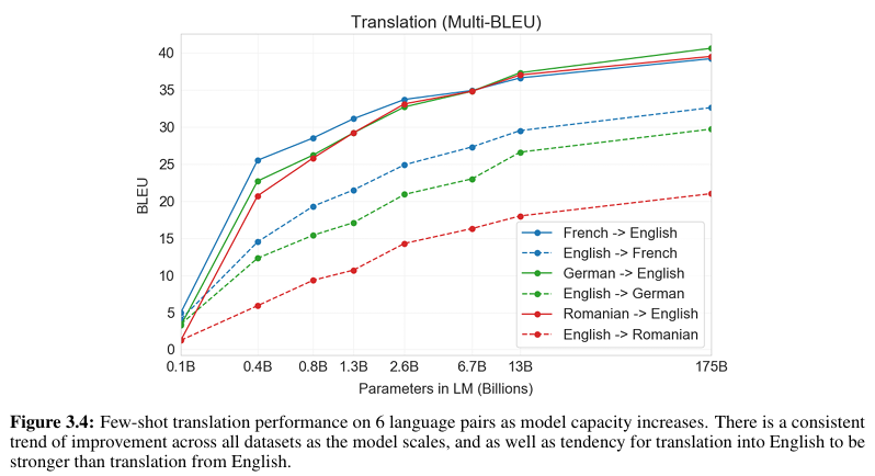 ■ machine translation에서도 비슷한 경향을 확인할 수 있다. 구체적으로, 어떠한 언어 번역 유형(예: 프랑스어-영어, 영어-독일어 등)에서도 x가 커질수록 y가 증가하는 것을 확인할 수 있다.