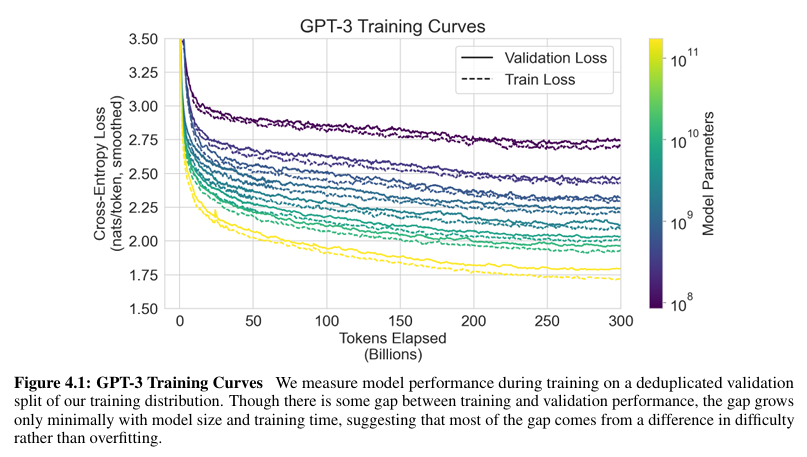 ■ Fig 4.1은 GPT-3가 과적합된 모델인지, 일반화 성능이 잘 갖춰진 모델인지 확인하기 위해 train loss와 valid loss를 시각화한 그림이다.