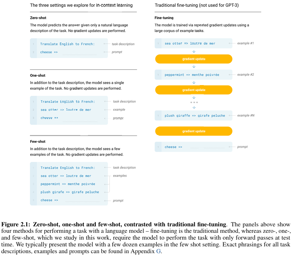 - Fig 2.1을 보면 one-shot의 경우, prompt 안에 ① task description과 ② 처리해야 할 문제, 그리고 'sea otter => loutre de mer'이라는 영어-프랑스어 번역 ③ example 1개가 존재하는 것을 확인할 수 있다.