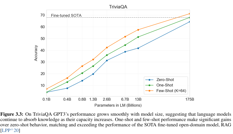 ■ QA 태스크인 TriviaQA에서도 Fig 3.2와 비슷한 경향(모델의 스케일이 커질수록 성능이 향상된다.)을 확인할 수 있다.