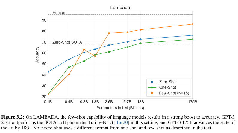 ■ 위의 Fig 3.2의 x축은 모델 크기(파라미터 개수), y축은 LAMBADA 데이터셋에서의 정확도를 나타낸 것이다.