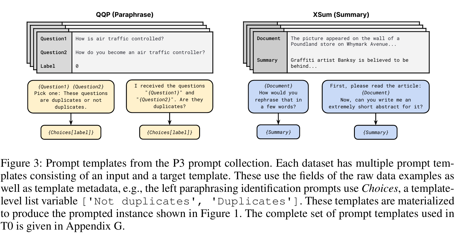 ■ Fig 3에서 보여주듯이, 저자들이 목표로 삼은 프롬프트 기반 멀티태스크 파인튜닝(multitask prompted finetuning)을 위해, 각 data example은 여러 다른 프롬프트 템플릿으로 구체화된다.