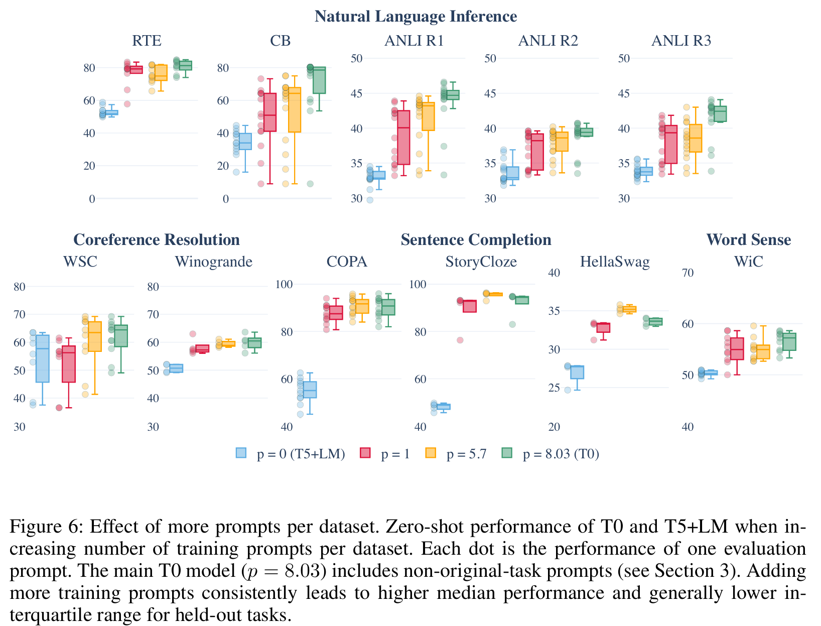 ■ p=5.7에서 p=8.03로 증가시킨 결과, 중앙값과 변동성이 더욱 개선되는 것을 볼 수 있다. 이는 original-task prompt뿐만 아니라 non-original-task prompt도 학습하는 것이 zero-shot generalization에 유익할 수 있음을 보여주는 결과이다.