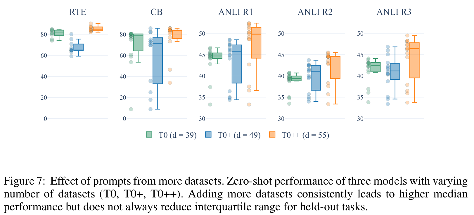 ■ 이는 일부 데이터셋(예: ANLI)의 경우, 매우 저조한 성능을 보이는 프롬프트들이 존재하며, training dataset의 수를 늘리면 성능에 좋은 영향을 미치는 프롬프트들이 추가되어 성능은 계속 올라가지만(즉, 중앙값은 올라가지만), 나쁜 프롬프트들의 성능은 바닥에 있기 때문에, 그 결과 성능의 최고점과 최저점의 격차가 더 벌어져 전체적인 변동성(boxplot의 높이)이 오히려 증가한 것이다.
