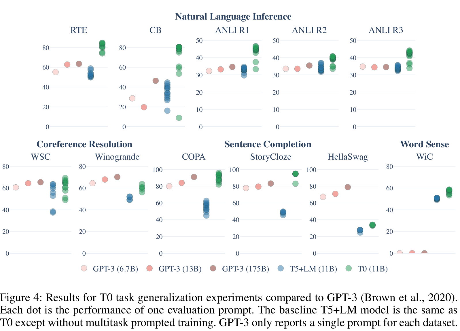- 이때 이 GPT-3는 하나의 best prompt만 선택하여 성능을 측정하지만, T0는 P3의 모든 프롬프트에 걸친 성능의 중앙값과 사분위 범위 값을 측정한다는 점을 유의해야 한다.