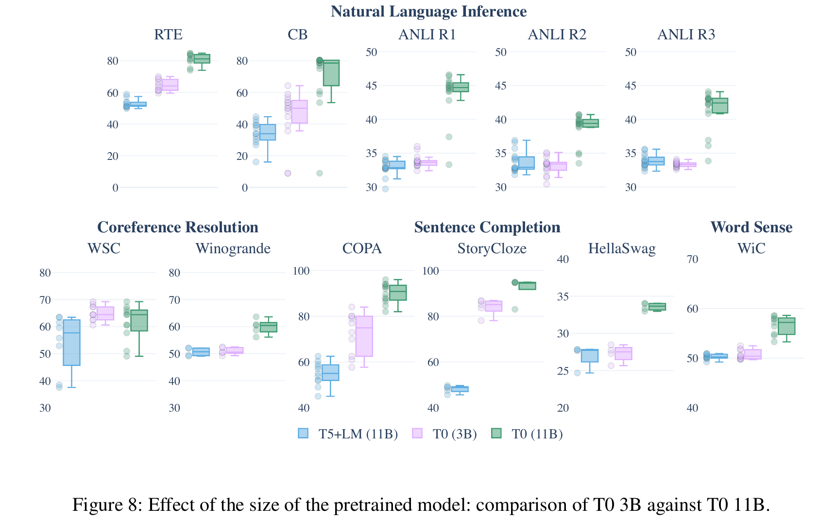 ■ FLAN에서는 T0(11B)와 비슷한 크기의 모델(8B)로 ablation을 수행하였고, multitask prompted training 후 held-out task의 성능이 오히려 감소함을 발견하였다. 그러나 T0에서는 multitask prompted training이 최소 3B만큼 작은 모델에서도 성능을 향상시킴을 발견했다. (Fig 8)