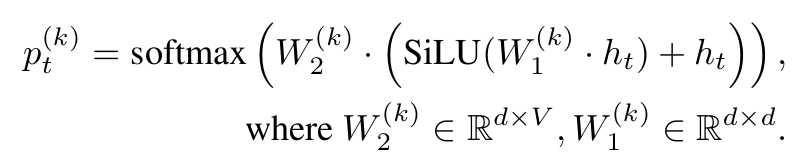 - 그러므로 \( p_t^{(k)} \)의 초기 출력은 \( W_2^{(k)} h_t \)가 되는데, 이는 결국 original lm head에서 \( t+1 \)번째 토큰을 예측하기 위해 계산한 값과 일치한다.