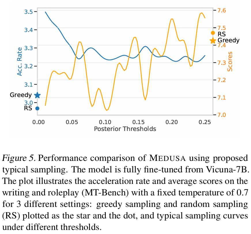 ■ typical acceptance의 임곗값도 MEDUSA-2 Vicuna-7B를 사용하여 MT-Bench의 'writing'과 'roleplay' 카테고리에서 평가하였다.