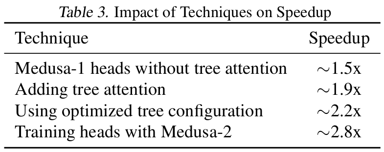 ■ 참고로 아래의 Table 3는 Medusa의 각 구성 요소가 최종 2.8배 가속에 얼마나 기여했는지를 단계별로 보여주는 performance decomposition table이다.
