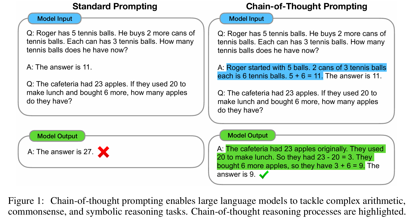 - 즉, answer를 직접 input으로 주는 standard prompting에서는 오답을 내던 문제가, 프롬프트에 CoT를 포함하자 모델이 스스로 reasoning steps을 거쳐 final output을 생성하며 정답을 맞출 수 있음을 보여준다.