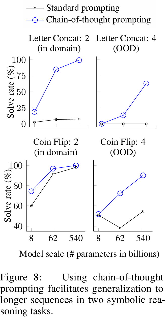 ■ OOD 상황에서 CoT prompting과 반대로 standard prompting의 성능은 모두 저조한 것을 볼 수 있다. 이는 CoT prompting이 충분히 큰 언어 모델에서는, 학습 시 보았던 chain of thought보다 더 긴 길이에 대해서도 추론 과정에서 일반화할 수 있음을 보여주는 결과이다.
