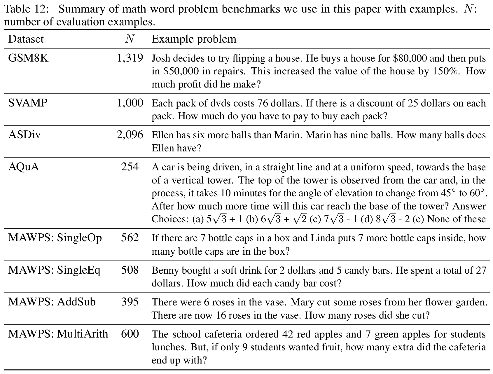 ■ 다섯 가지 math word problem benchmarks을 고려하였다: (1) GSM8K (2) SVAMP (3) ASDiv (4) AQuA (5) MAWPS