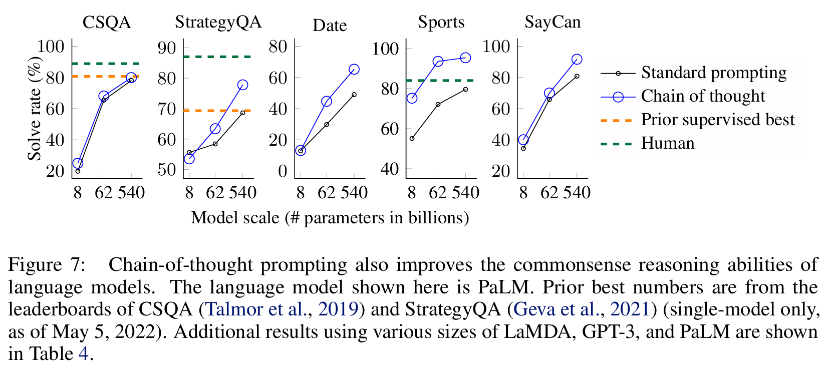 ■ CoT prompting은 추가적인 성능 향상을 이끌어냈으며, 그 향상은 PaLM 540B에서 가장 큰 것을 볼 수 있다. 이는 CoT prompting이 다양한 상식 추론 능력을 요구하는 tasks에서도 성능을 향상시킬 수 있음을 입증하는 결과이다.