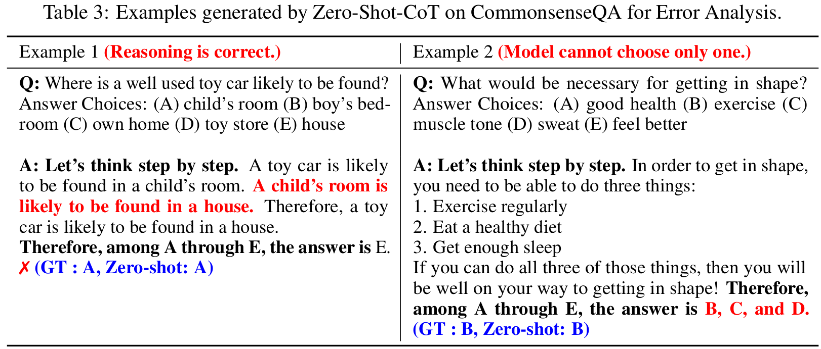 ■ 관찰 결과, (1) commonsense reasoning(CommonsenseQA)에서 Zero-shot CoT는 최종 예측이 틀리는 경우에서도 종종 유연하고 합리적인 chain of thought를 생성한다. 그리고 정답을 하나로 좁히기 어렵다고 느낄 때, 여러 개의 정답 선택지를 출력한다. (예: Table 3의 Example 2의 최종 예측)