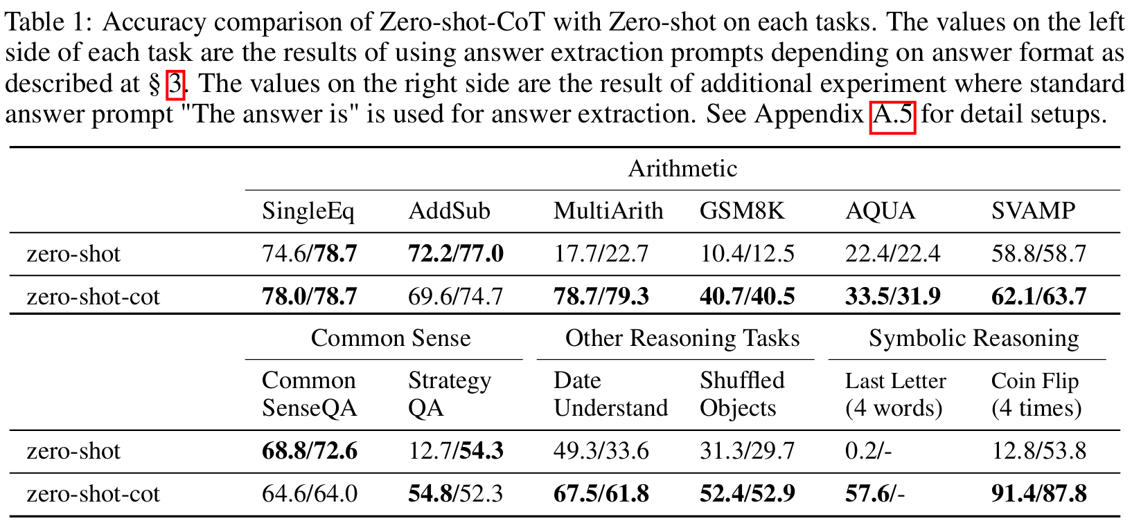 ■ chain of thought reasoning의 효과를 검증하기 위해 Zero-shot CoT를 standard zero-shot prompting과 비교한다. zero-shot 실험을 위해, Zero-shot CoT와 유사한 정답 유도 프롬프트가 기본으로 사용된다. (결과는 Table 1, 사용된 프롬프트에 대한 details은 Appendix A.5 Table 9, 10)