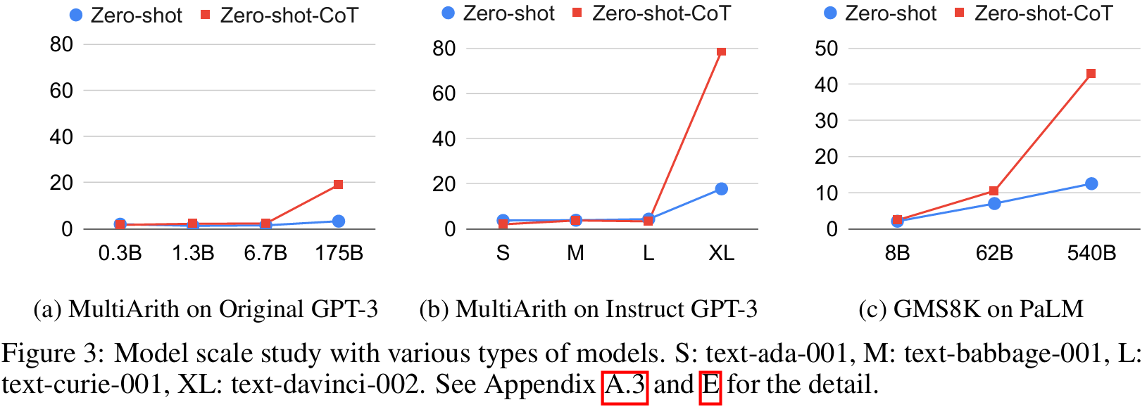 ■ 대조적으로, original/Instruct GPT-3와 PaLM의 경우 모델 크기가 작을 때는 chain of thought reasoning이 효과적이지 않지만, 모델 크기가 커짐에 따라 chain of thought reasoning을 사용했을 때 성능이 급격하게 증가하는 것을 볼 수 있다.