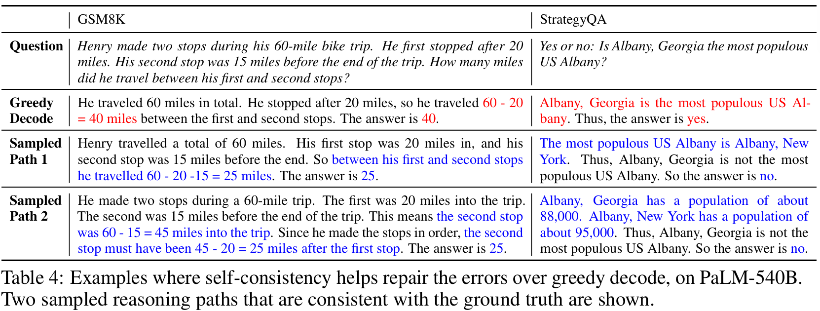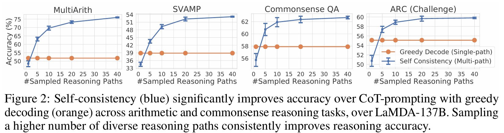 self-consistency는 다양한 reasoning paths과 majority voting을 통해 그 공백을 메우고 성능을 향상시킬 수 있다.