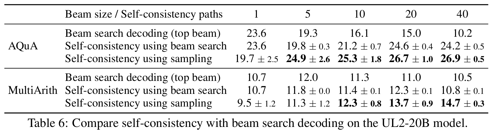 ■ Table 6에서 self-consistency가 AQuA와 MultiArith에서 beam search를 크게 능가한 것을 볼 수 있다.