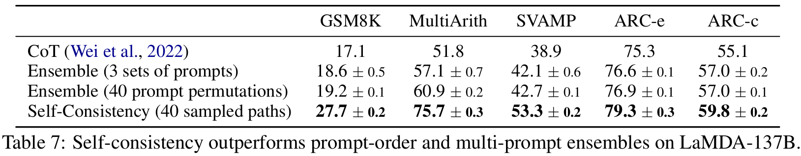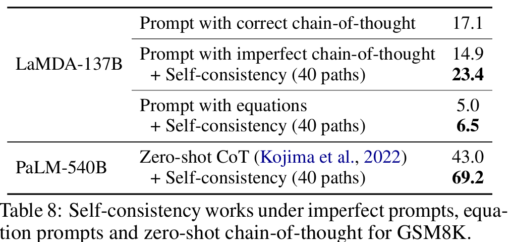 - 예를 들어 "There are 3 cars in the parking lot already. 2 more arrive. Now there are 3 + 2 =5cars." 대신 방정식으로 구성된 "3+2=5"를 사용해서, 자연어로 설명하지 않고 수식만 써도 self-consistency가 잘 작동하는지 테스트한 것이다.