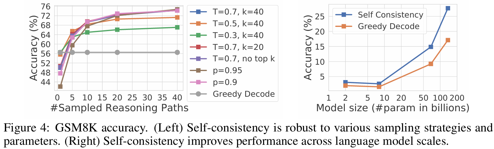 - 이때 self-consistency은 temperature sampling, top-\( k \) sampling, nucleus sampling을 포함한 대부분의 기존 샘플링 알고리즘과 호환된다.