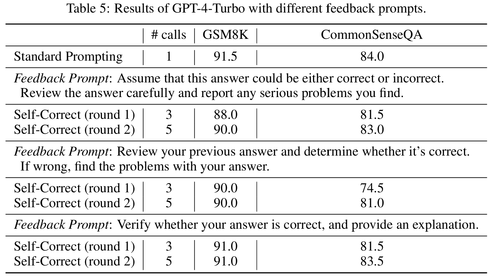 ■ 저자들이 평가한 모든 유형의 feedback 프롬프트에서, self-correction이 reasoning 성능을 감소시키기는 하지만, feedback 프롬프트에 따라 성능이 달라진다는 것을 확인할 수 있다. (섹션 3의 Table 5, 6)
