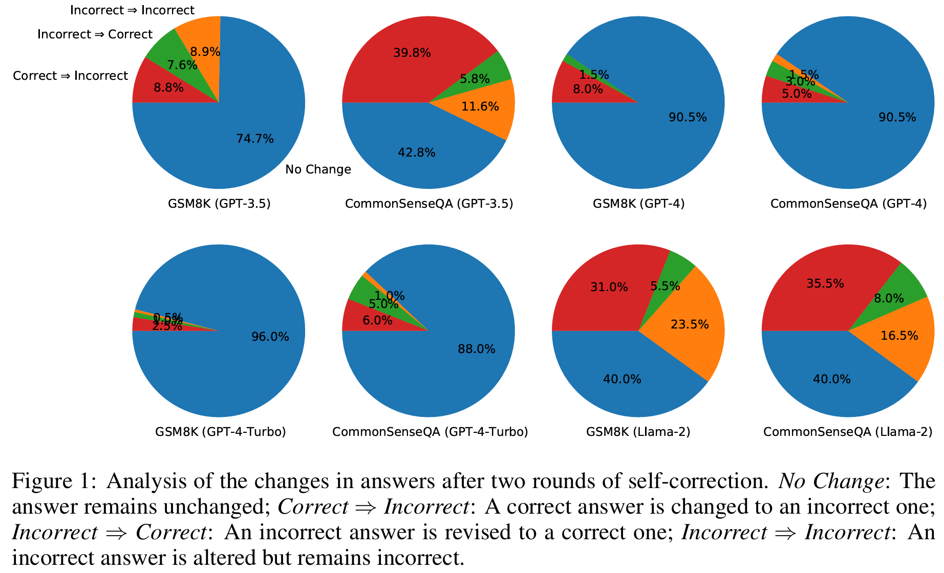 ■ 그러므로 CommonSenseQA에서 self-correction을 사용하는 것이 모델로 하여금 다른 선택지를 고르도록 유도하여 높은 "correct => incorrect" 비율로 이어질 수 있다.