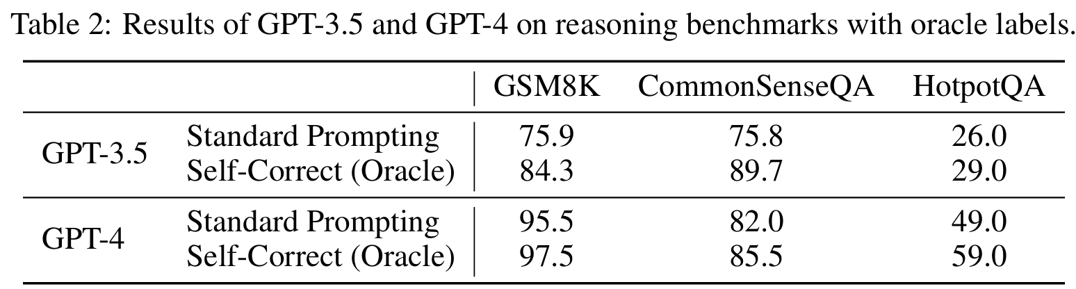 ■ 먼저 이전 연구들을 따라 GPT-3.5-Turbo와 GPT-4를 사용하여 oracle labels이 있는 self-correction을 평가한다.
