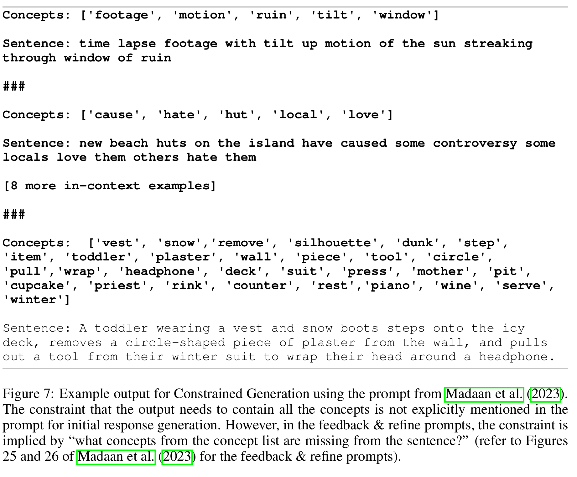 ■ 이러한 관찰을 바탕으로, 저자들은 self-refine의 실험을 그대로 따라하되, 초기 응답 생성을 위한 프롬프트에 "위의 concepts *모두*를 포함하는 합리적인 문단을 작성해라"라는 instruction을 추가하였다. (전체 프롬프트는 Fig 8)