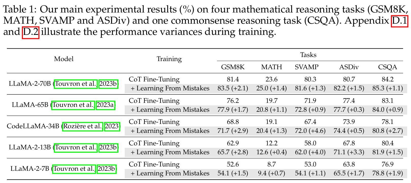 ■ Table 1에서 볼 수 있듯이, LLaMA-2-70B는 CoT-alone fine-tuning에서 가장 높은 baseline performances을 보이면서도, LEMA로도 5개 tasks 모두에서 상당한 향상을 달성했다.