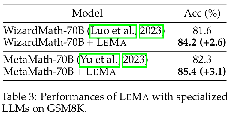 ■ pre-trained LLMs 중에는 수학 도메인에 특화된 WizardMath나 MetaMath와 같은 domain-specific LLMs이 있다. 저자들은 이러한 특화된 LLMs에도 LEMA가 효과가 있는지 확인했다.