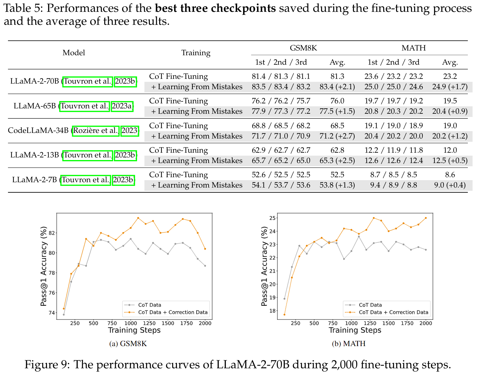 - D.2의 Fig 9.는 2,000번의 fine-tuning steps 동안 LLaMA-2-70B의 성능 곡선이다. correction data를 추가하면 training 중에 뚜렷한 개선이 나타나는 것을 볼 수 있다.