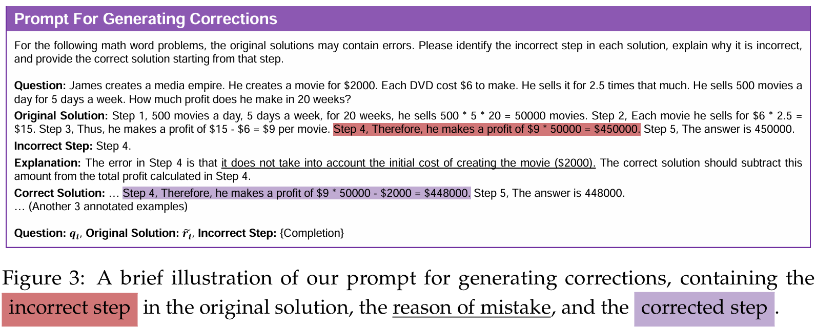 ■ GPT-4로 생성된 corrections에는 세 가지 정보가 포함되어 있다: (1) 원래 풀이에서 잘못된 step (2) 이 step에서 왜 잘못되었는지에 대한 설명 (3) 올바른 최종 정답으로 이어지기 위해 원래 풀이를 어떻게 수정해야 하는지