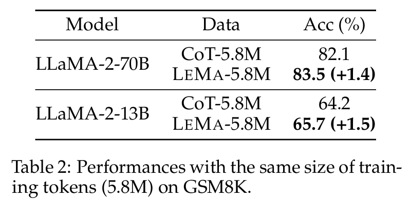 ■ Table 2는 동일한 수의 training tokens을 사용하더라도 LEMA가 여전히 CoT-alone fine-tuning보다 우수함을 보여준다.