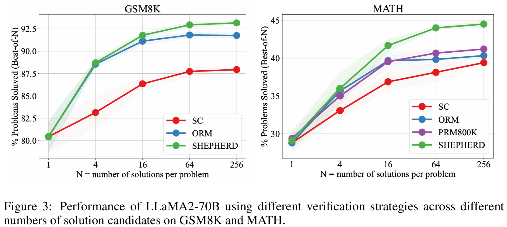 ■ Fig 3은 GSM8K와 MATH에서 1개부터 256개까지의 서로 다른 candidates 개수를 사용했을 때, 각 방법들의 성능을 비교한 것이다.