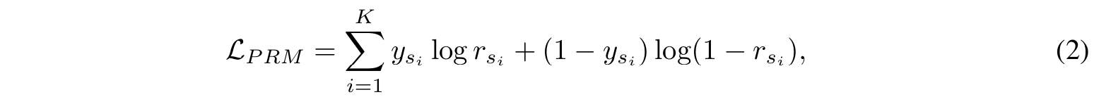 - 여기서 \( y_{s_i} \)는 \( s \)의 \( i \)번째 step의 정답 여부이고, \( r_{s_i} \)는 PRM이 할당한 \( s_i \)의 sigmoid score이며, \( K \)는 solution \( s \)의 reasoning steps의 개수이다.