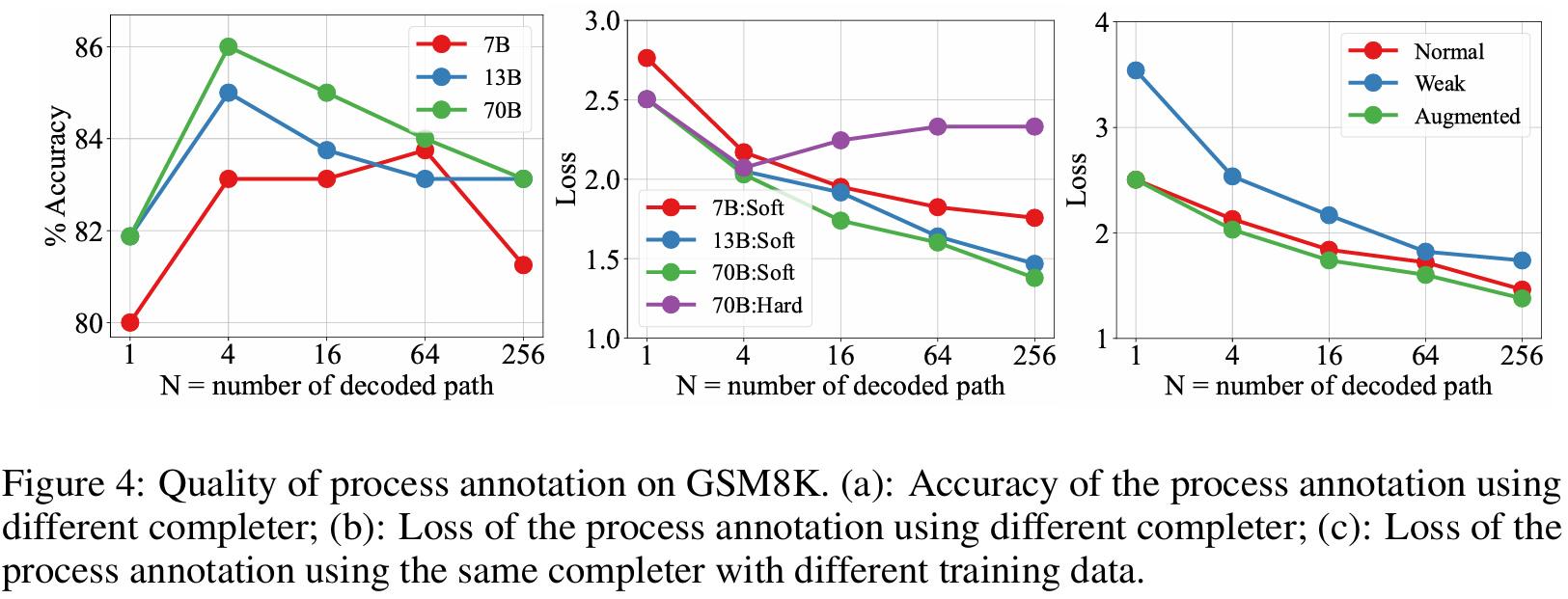 ■ Fig 4 (b)는 MetaMATH로 학습된 다양한 completers에 걸친 cross-entropy loss이다. 크기가 더 큰 completer가 우수한 품질의 데이터셋을 생성하는 데 더 뛰어남을 확인할 수 있다.