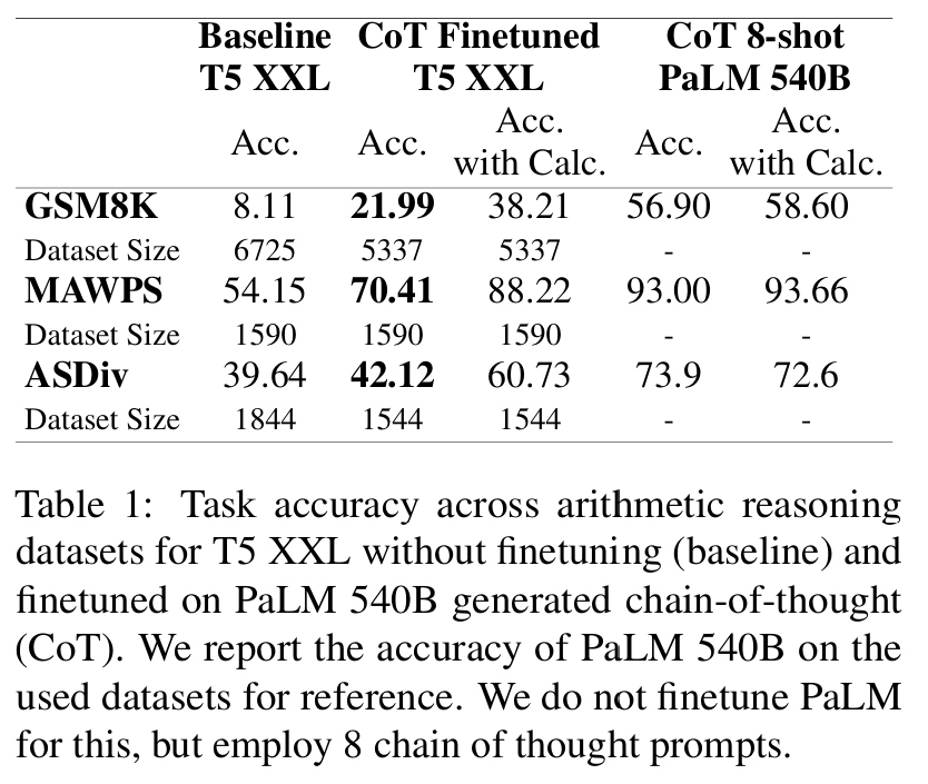 ■ T5 XXL보다 파라미터 수가 44배 적은 T5 Base가 CoT 데이터로 학습되었을 때, baseline T5 XXL의 성능에 필적하는 것을 볼 수 있다. 그리고 external calculator가 주어지면, baseline T5 XXL의 성능을 능가한다.
